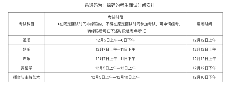 2.在相應(yīng)科目考試既定安排時(shí)段內(nèi),仍為非綠碼(衛(wèi)健部門認(rèn)定須在特定隔離考點(diǎn)考試的除外)的考生,統(tǒng)一安排在規(guī)定時(shí)間緩考,其中:視唱、聲樂、器樂科目安排在12月12日上午,舞蹈學(xué)安排在12月12日下午,播音與主持藝術(shù)安排在12月10日下午??忌鷳{身份證、準(zhǔn)考證離開居住地(含酒店、住宅、小區(qū)),持24小時(shí)核酸檢測陰性報(bào)告前往考點(diǎn)參加考試,赴考途中全程佩戴N95口罩、做好個(gè)人防護(hù),不得乘坐公共交通工具,考后須立即返回居住地,落實(shí)居住地與考點(diǎn)閉環(huán)管理。
