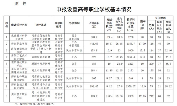12月14日,河南省教育廳發(fā)布《關(guān)于2022年申報設置高等職業(yè)學校的公示》。新增申報高校分別為:焦作新材料職業(yè)學院、開封職業(yè)學院、洛陽商業(yè)職業(yè)學院、南陽工藝美術(shù)職業(yè)學院、濮陽科技職業(yè)學院、商丘幼兒師范高等專科學校、鄭州軟件職業(yè)技術(shù)學院、鄭州智能工程職業(yè)學院、周口理工職業(yè)學院。