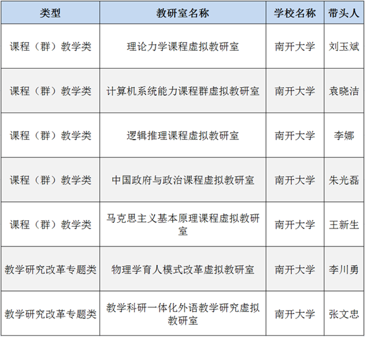 近日,教育部公布了首批虛擬教研室建設(shè)試點(diǎn)名單,南開大學(xué)7個(gè)基層教學(xué)組織獲批。