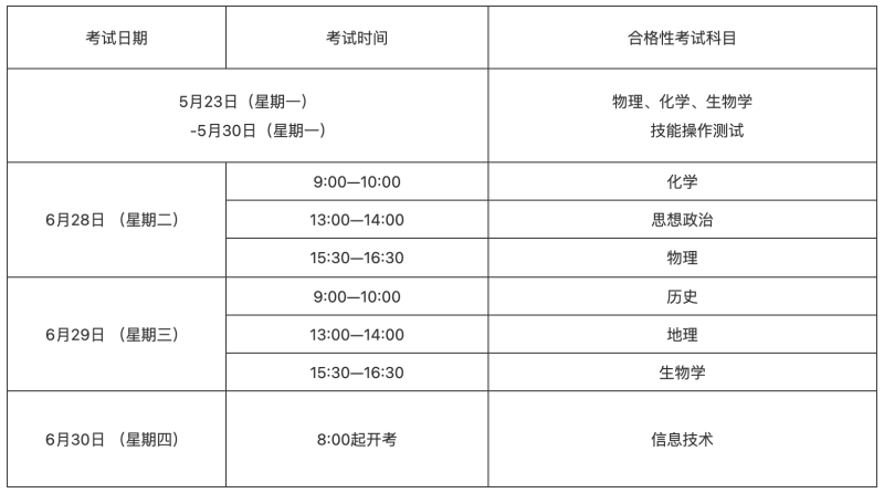 6月合格性考試設(shè)思想政治、歷史、地理、物理、化學(xué)、生物學(xué)和信息技術(shù)7門科目。