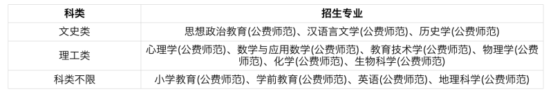 為了發(fā)展農村教育,培養(yǎng)優(yōu)秀農村師資,我校2023年高校專項計劃招生面向公費師范專業(yè),招生計劃為80人,具體招生專業(yè)見下表。