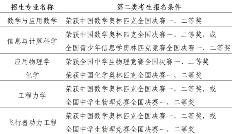 榮獲全國青少年學科奧林匹克競賽(數(shù)學、物理、化學、信息學)全國決賽一、二等獎。全國青少年學科奧林匹克競賽獲獎學生以全國青少年科技競賽獲獎名單公示網(wǎng)站(http://gs.cyscc.org/)公示的名單為準。各招生專業(yè)對應(yīng)的報名條件如下表所示。