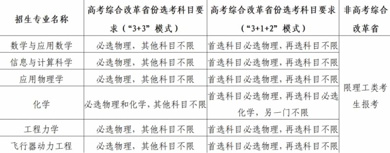 我校2023年強基計劃招生專業(yè)為數(shù)學與應(yīng)用數(shù)學、信息與計算科學、應(yīng)用物理學、化學、工程力學、飛行器動力工程。符合第一、第二類報名條件的考生在各?。ㄗ灾螀^(qū)、直轄市)可填報的招生專業(yè)和招生計劃以我校強基計劃報名系統(tǒng)公布為準?! ?/p>