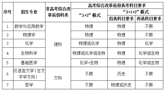 為突出基礎學科在國家關鍵領域的支撐引領作用,同時聚焦國家人才緊缺的人文社會科學領域,我校強基計劃招生專業(yè)設置如下:數(shù)學與應用數(shù)學、物理學、化學、生物科學、基礎醫(yī)學﹑漢語言文學(古文字學方向)﹑哲學。