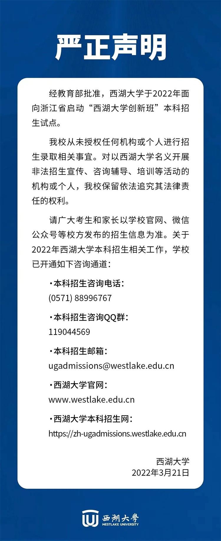 3月21日,西湖大學(xué)發(fā)布《關(guān)于2022年西湖大學(xué)本科招生的嚴(yán)正聲明》。聲明稱,經(jīng)教育部批準(zhǔn),西湖大學(xué)于2022年面向浙江省啟動“西湖大學(xué)創(chuàng)新班”本科招生試點。從未授權(quán)任何機構(gòu)或個人進行招生錄取相關(guān)事宜。對以西湖大學(xué)名義開展非法招生宣傳、咨詢輔導(dǎo)、培訓(xùn)等活動的機構(gòu)或個人,學(xué)校保留依法追究其法律責(zé)任的權(quán)利。