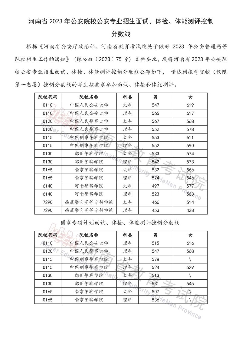 河南2023年公安院校公安專業(yè)招生面試、體檢、體能測評控制分?jǐn)?shù)線公布