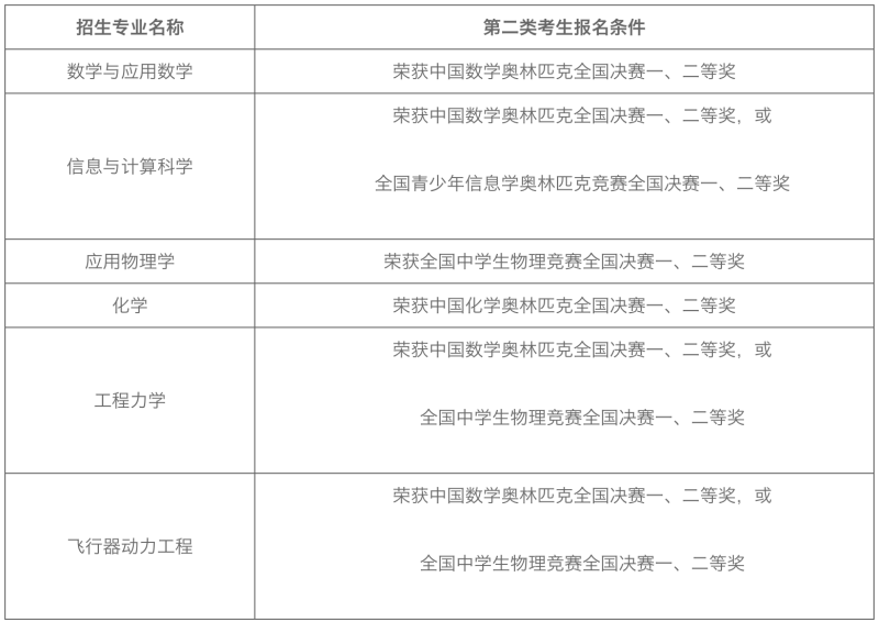 榮獲全國青少年學(xué)科奧林匹克競賽(數(shù)學(xué)、物理、化學(xué)、信息學(xué))全國決賽一、二等獎。全國青少年學(xué)科奧林匹克競賽獲獎學(xué)生以全國青少年科技競賽獲獎名單公示網(wǎng)站(http://gs.cyscc.org/)公示的名單為準(zhǔn)。各招生專業(yè)對應(yīng)的報名條件如下表所示。