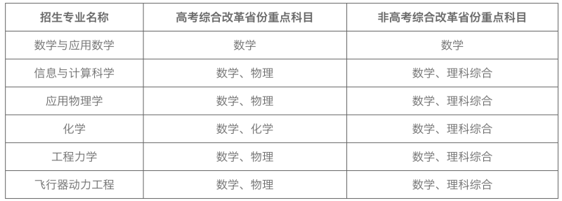 我校2022年強基計劃招生專業(yè)為數(shù)學(xué)與應(yīng)用數(shù)學(xué)、信息與計算科學(xué)、應(yīng)用物理學(xué)、化學(xué)、工程力學(xué)、飛行器動力工程。符合第一、第二類報名條件的考生在各?。ㄗ灾螀^(qū)、直轄市)可填報的招生專業(yè)和招生計劃以我校強基計劃報名系統(tǒng)公布為準(zhǔn)?! ?/p>