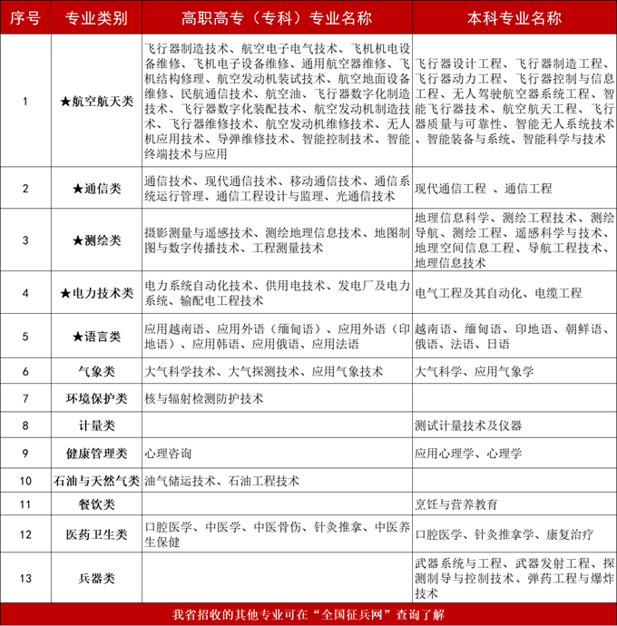 今年我省共計(jì)劃招收航空航天、語(yǔ)言(小語(yǔ)種)、電子信息、通信、環(huán)境保護(hù)、醫(yī)藥衛(wèi)生、健康管理、電力技術(shù)、測(cè)繪等41個(gè)軍民通用專(zhuān)業(yè),詳細(xì)專(zhuān)業(yè)可在“全國(guó)征兵網(wǎng)”-“招收軍士”-“招收專(zhuān)業(yè)查詢(xún)”處查詢(xún)了解。