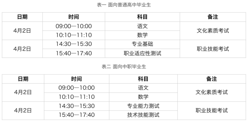 2024年4月2日,考生在高考報名所在的縣(市、區(qū))參加考試,采取筆試形式。具體各科目考試時間見下表: