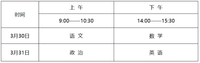 文化考試科目為語文、數(shù)學(xué)、政治、英語四科,每科滿分為150分,四科滿分為600分,使用國家通用語言文字作答。