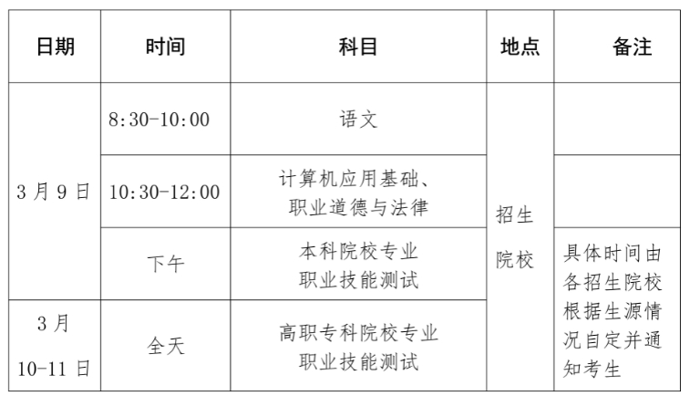 2024年3月22日前,各招生院校須將考生的職業(yè)技能測試成績上傳至報名系統(tǒng),4月12日前省考試局統(tǒng)一向考生公布成績。