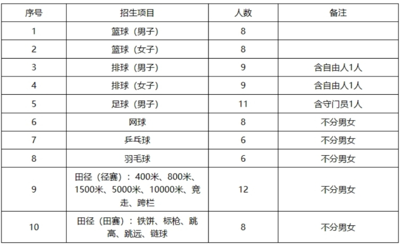 (一)招生項(xiàng)目:籃球、排球、男子足球(十一人制)、網(wǎng)球、乒乓球、羽毛球、田徑。