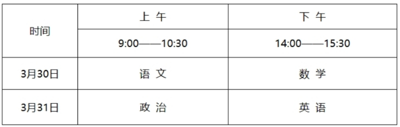 (六)文化考試科目為語文、數(shù)學(xué)、政治、英語四科,每科滿分為150分,四科滿分為600分,使用國家通用語言文字作答。文化考試時(shí)間: