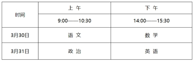 文化考試科目:語文、數(shù)學、政治、英語;考試分值:每科滿分為150分,總分滿分為600分,使用國家通用語言文字作答。考試時間: