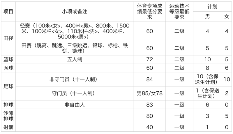 (三)報(bào)考田徑、籃球、網(wǎng)球項(xiàng)目考生須具備二級(jí)運(yùn)動(dòng)員(含)以上運(yùn)動(dòng)技術(shù)等級(jí)稱號(hào),報(bào)考其余項(xiàng)目考生須具備一級(jí)運(yùn)動(dòng)員(含)以上運(yùn)動(dòng)技術(shù)等級(jí)稱號(hào)。