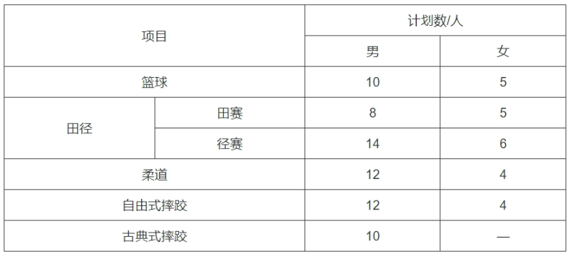 招生項(xiàng)目:籃球、田徑、柔道、摔跤(自由式、古典式),分項(xiàng)目擬招生計(jì)劃如下表所示(最終計(jì)劃以上級(jí)主管部門批復(fù)的為準(zhǔn))。