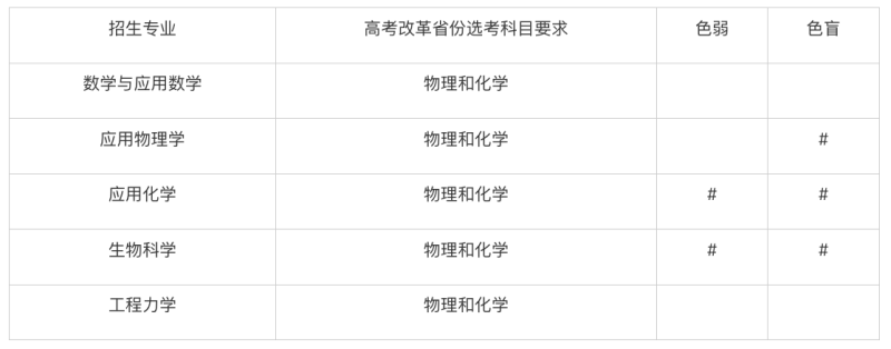 我校招生專業(yè)包括數(shù)學(xué)與應(yīng)用數(shù)學(xué)、應(yīng)用物理學(xué)、應(yīng)用化學(xué)、生物科學(xué)和工程力學(xué)。所有招生專業(yè)在非高考改革省份招收理科考生,在高考改革省份選考科目要求見下表: