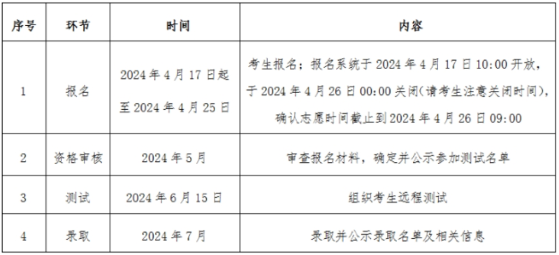 報(bào)名時(shí)間為2024年4月17日 -2024年4月25日。報(bào)名系統(tǒng)于2024年4月17日10:00開放,于2024年4月26日00:00關(guān)閉(請(qǐng)考生注意關(guān)閉時(shí)間),確認(rèn)志愿時(shí)間截止到2024年4月26日09:00,未確認(rèn)志愿的考生報(bào)名無效。