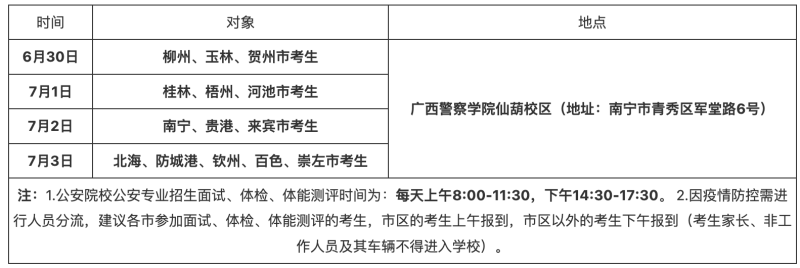 6月30日至7月3日為招生面試、體檢和體能測評時(shí)間。各市時(shí)間安排如下表: