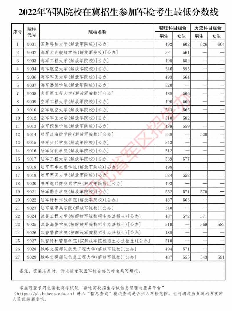 河北省2022年軍隊院校在冀招生參加軍檢考生最低分數(shù)線出爐