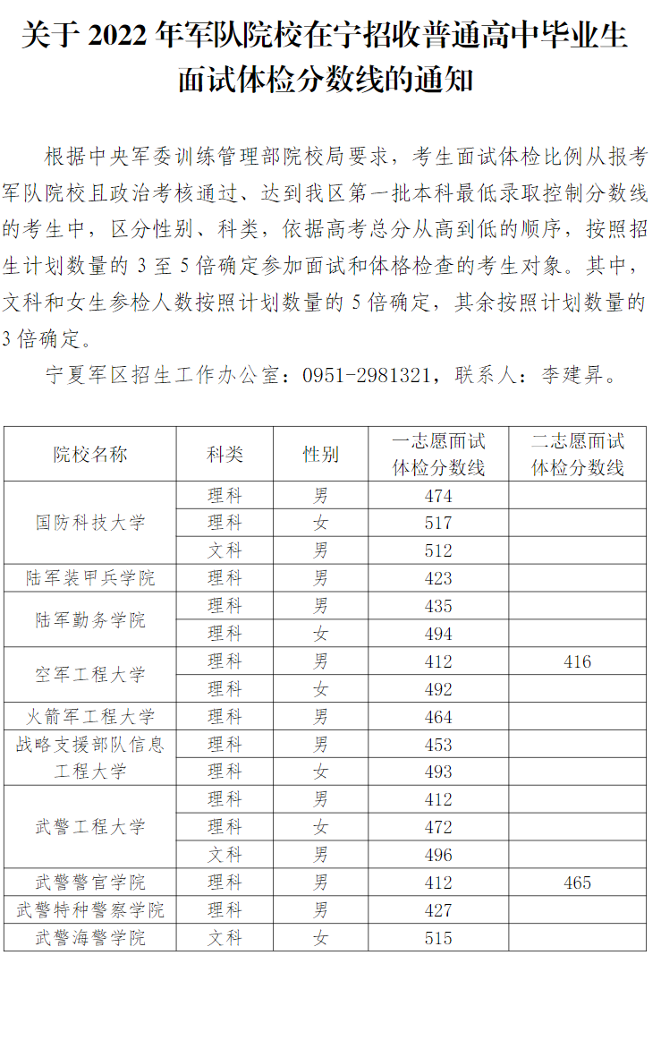 據(jù)悉寧夏2022年軍隊(duì)院校在寧招收普通高中畢業(yè)生面試體檢分?jǐn)?shù)線已經(jīng)出爐,具體通知如下:
