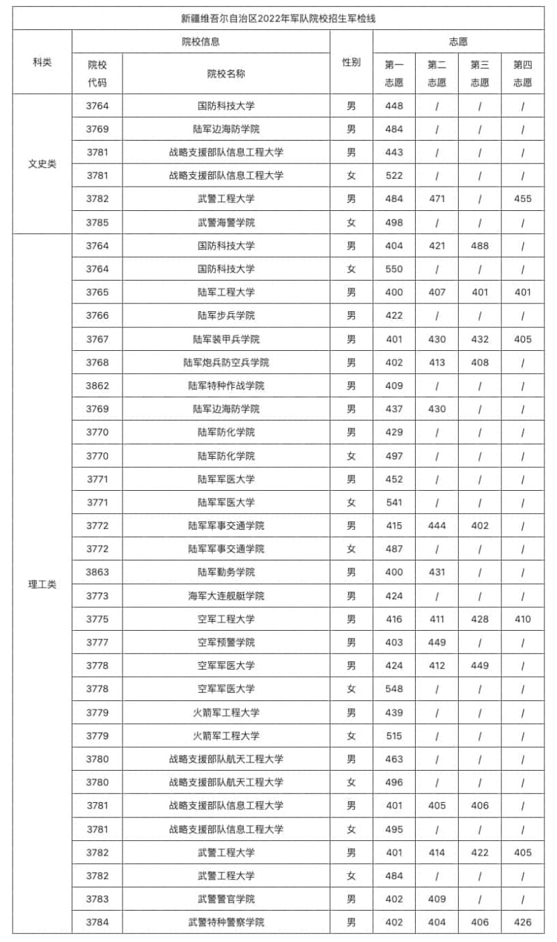 根據(jù)《關(guān)于做好2022年軍隊院校招收普通高中畢業(yè)生工作的通知》(新招委〔2022〕7號)文件規(guī)定,新疆軍區(qū)招生工作辦公室結(jié)合報考軍隊院??忌嚓P(guān)情況,按比例劃定軍隊院校在疆招收普通高中畢業(yè)生面試體檢控制分?jǐn)?shù)線。