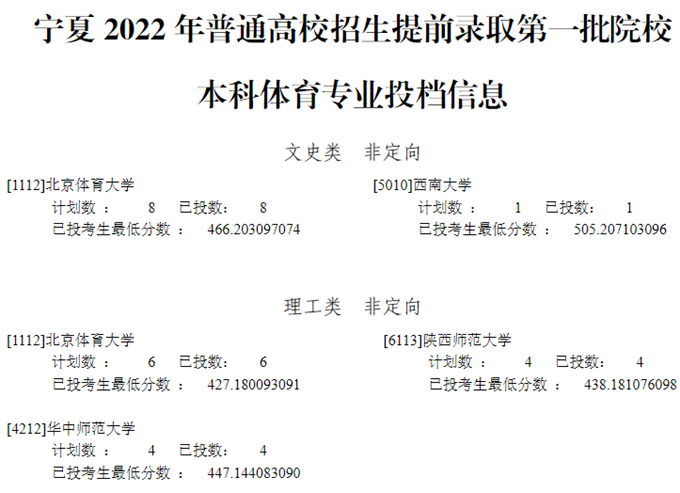 寧夏2022年普通高校招生提前錄取一本體育專業(yè)投檔信息是什么,小編整理如下: