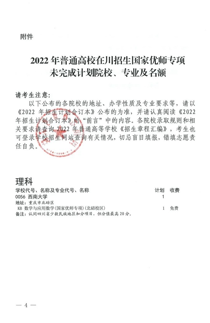 四川省國(guó)家優(yōu)師專項(xiàng)未完成計(jì)劃院校征集志愿7月8日19點(diǎn)截止