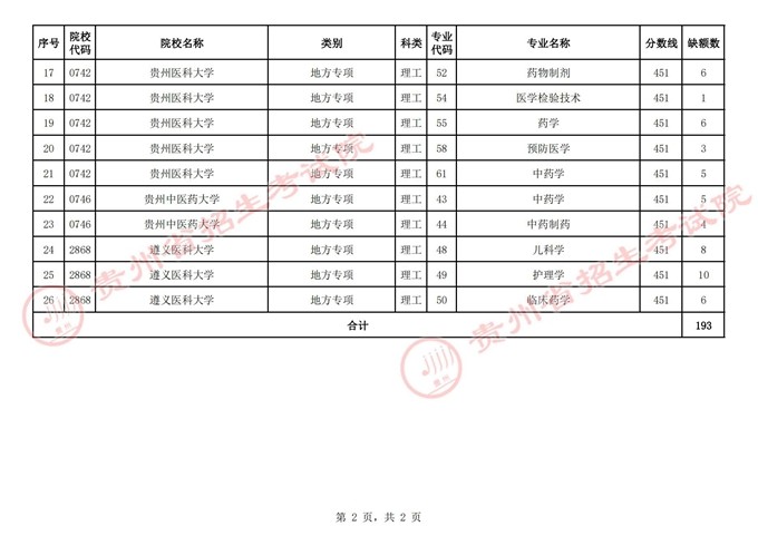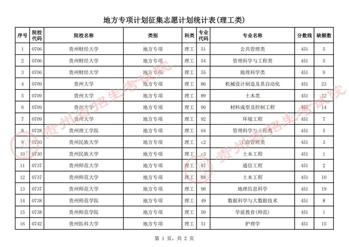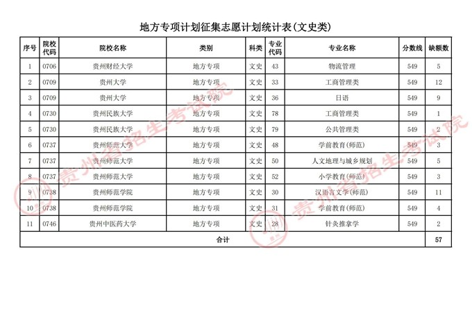 一、地方專項計劃報考資格審核合格且分?jǐn)?shù)達(dá)到一本線(文史549分,理工451分)的未被錄取考生,可根據(jù)附表公布的計劃情況填報志愿,考生填報時請仔細(xì)查閱《貴州省2022年高考高校招生專業(yè)目錄》和院校招生章程了解各院校招生專業(yè)的特殊要求。