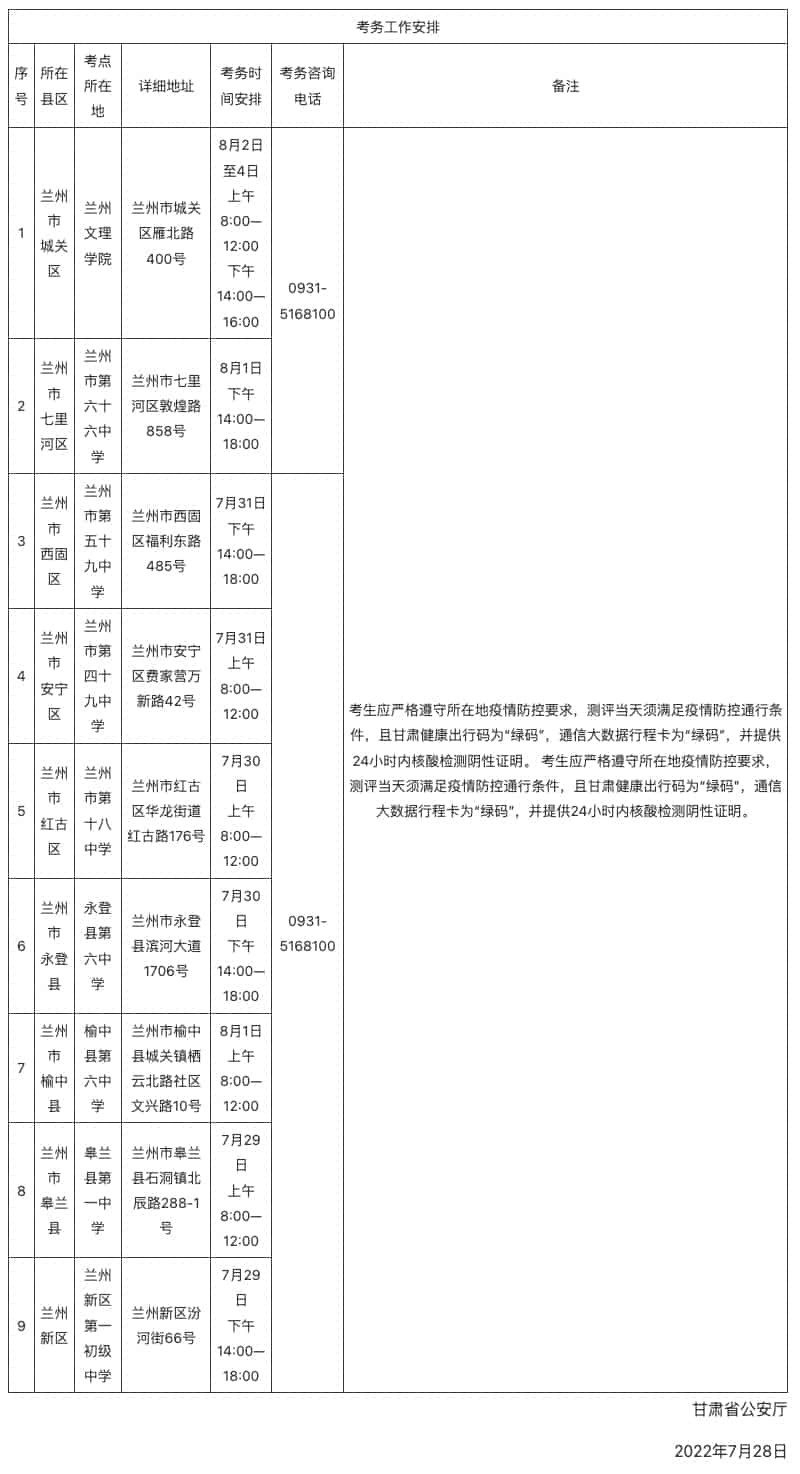 結(jié)合疫情防控有關(guān)要求,經(jīng)蘭州市相關(guān)部門綜合研判決定,采取由蘭州市公安局統(tǒng)一組織,考生就近在現(xiàn)居住地所在縣、區(qū)參加的方式,開展面試、體檢、體能測評?,F(xiàn)將各縣、區(qū)考點具體時間和地點公布如下(詳見下表)。請考生嚴(yán)格遵守所在地疫情防控要求,在滿足疫情防控通行條件的情況下,按公告要求參加測評,如有疑問請及時撥打考務(wù)咨詢電話。