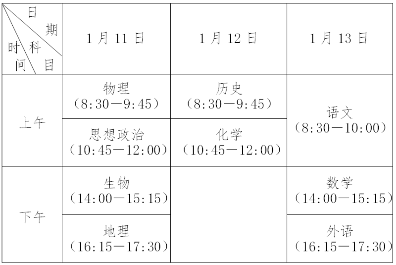 考試時間為2023年1月11—13日。除語文科目考試時長為90分鐘外,其他各科目均為75分鐘。具體如下: