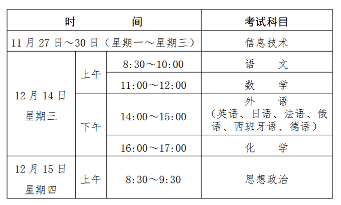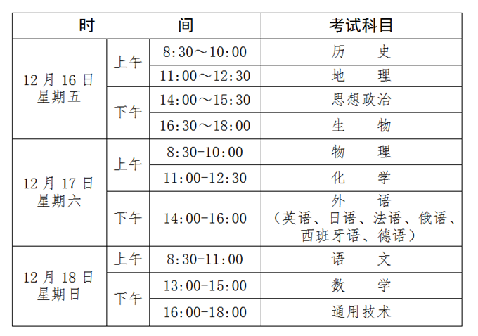 2.12月學(xué)業(yè)水平合格性科目為語文、數(shù)學(xué)、外語、化學(xué)、思想政治5個(gè)科目,時(shí)間為12月14日—15日。