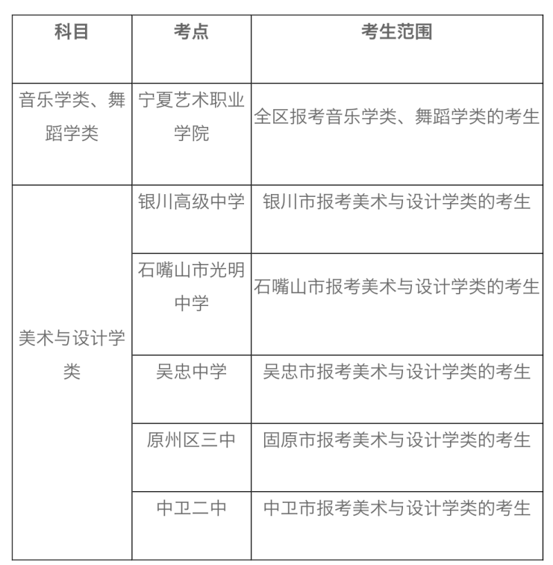 音樂學(xué)類和舞蹈學(xué)類的考生可于2023年1月2日下午到寧夏藝術(shù)職業(yè)學(xué)院考點(diǎn),美術(shù)與設(shè)計學(xué)類的考生可于2022年12月29日下午到相應(yīng)考點(diǎn)查看考場安排、考試注意事項、面試時間安排等。