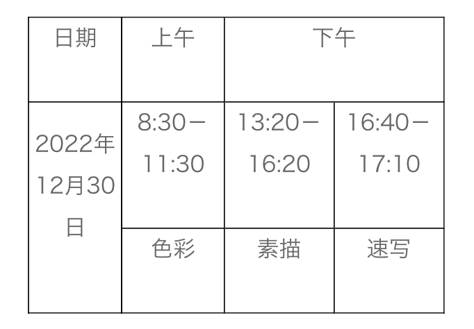 速寫科目采取人物動態(tài)默寫方式考查;素描和色彩科目使用圖片模擬寫生方式考查。試卷一律采用8開紙作為統(tǒng)考用紙(由考場統(tǒng)一提供),全部科目實(shí)行網(wǎng)上閱卷。