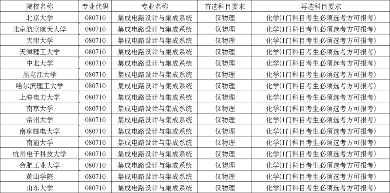 集成電路設(shè)計與集成系統(tǒng)專業(yè)大部分高校首選科目是物理,再選科目要求化學(xué)!部分學(xué)校有自己的要求,具體情況請同學(xué)們以各省招生的學(xué)校和專業(yè)實(shí)際公布要求為準(zhǔn)。下圖僅供同學(xué)們參考。