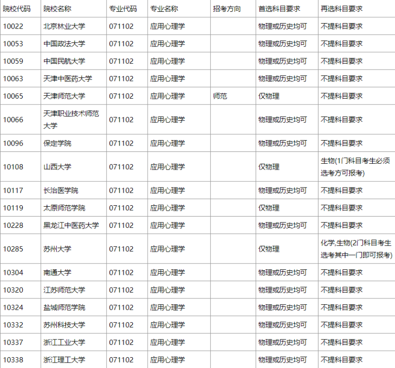 應(yīng)用心理學(xué)專業(yè)大部分院校高考首選科目是物理或者歷史,再選科目不限要求,個(gè)別院校首選科目僅物理,再選科目生物1門科目考生必須選考方可報(bào)考,或者是化學(xué),生物2門科目考生選考其中一門即可報(bào)考。