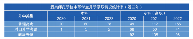近三年來,酒泉師范學(xué)校中職學(xué)生參加普通高考和對(duì)口升學(xué)考試,463人被高等院校錄取,其中本科以上164人,專科以上476人,轉(zhuǎn)段升學(xué)298人。