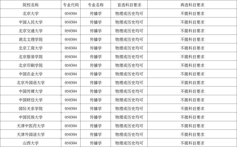 傳播學(xué)專業(yè)大部分高校首選科目是物理或歷史,再選科目要求不限!部分學(xué)校有自己的要求,具體情況請(qǐng)同學(xué)們以各省招生的學(xué)校和專業(yè)實(shí)際公布要求為準(zhǔn)。下圖僅供同學(xué)們參考。