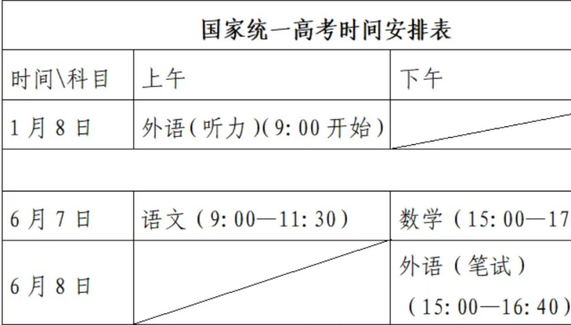 (一)國家統(tǒng)一高考。國家統(tǒng)一高考科目使用全國統(tǒng)一命題試卷,考試時(shí)間安排在6月7日全天和6月8日下午,其中語文考試時(shí)間為150分鐘,數(shù)學(xué)考試時(shí)間為120分鐘,外語(筆試)考試時(shí)間為100分鐘;外語(聽力)考試安排在1月8日上午,連續(xù)組織兩次,每次考試時(shí)長約20分鐘,考試成績?nèi)纱沃械母叻钟?jì)入外語科目成績。