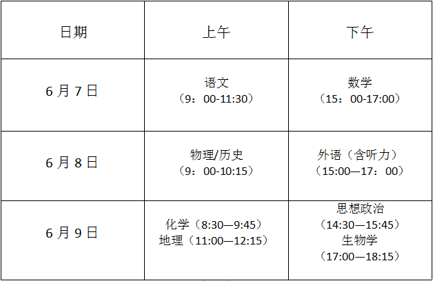 考試時間安排在6月7日至9日。語文科目考試時長為150分鐘,數學、外語科目考試時長均為120分鐘,學業(yè)水平選擇性考試科目每科考試時長均為75分鐘。