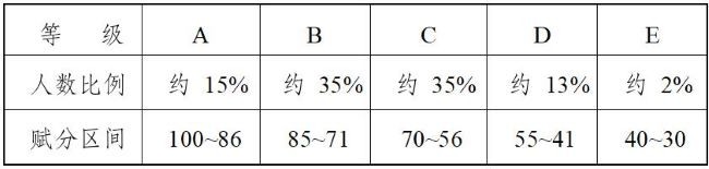 具體轉換步驟如下:第一步,按照每門選擇性考試科目考生的原始分從高到低劃定A、B、C、D、E共五個等級,各等級人數所占比例分別約為15%、35%、35%、13%和2%,將考生的原始分轉換成等級。第二步,將A至E五個等級內的考生原始分,依照等比例轉換方法,分別對應轉換到100~86、85~71、70~56、55~41和40~30五個分數區(qū)間,得到考生的等級分。每門選擇性考試科目等級分數的轉換基數為實際參加該科目考試并取得有效成績的人數。具體選擇性考試科目等級分轉換方法及示例如下: