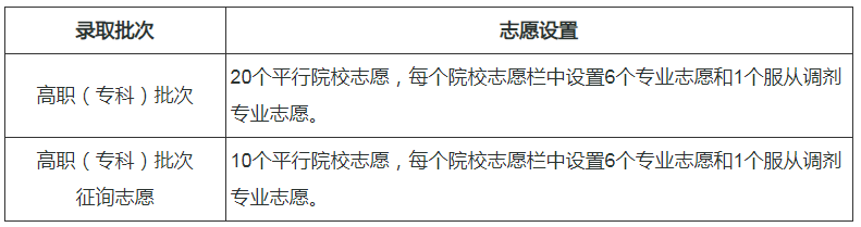 提前高職(??疲┡卧O(shè)置1個(gè)院校志愿,院校志愿中設(shè)置3個(gè)專業(yè)志愿和1個(gè)服從調(diào)劑專業(yè)志愿。