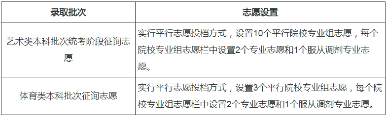 藝術(shù)類、體育類考生填報(bào)志愿實(shí)行“兩次填報(bào)”“一次征詢”的方式。相關(guān)批次的填報(bào)工作須在規(guī)定時(shí)間內(nèi)完成,逾期不再補(bǔ)報(bào)。