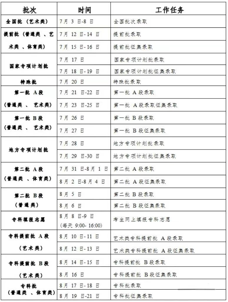 本科一批A段錄取:7月21日-22日;7月23日-25日本科一批A段征集錄取;
